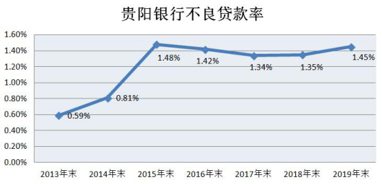 贵阳银行不良贷款逐年上涨。截至2013年末、2014年末、2015年末、2016年末、2017年末、2018年末、2019年末,贵阳银行不良贷款余额分别为3.39亿元、5.71亿元、12.34亿元、14.52亿元、16.82亿元、23.06亿元、29.61亿元;不良贷款率分别为0.59%、0.81%、1.48%、1.42%、1.34%、1.35%、1.45%。