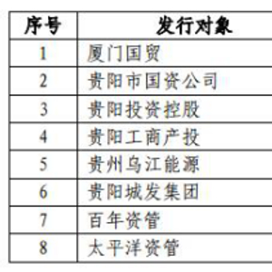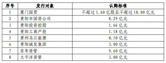 3月3日,贵阳银行公布的非公开发行A股股票预案(修订稿)显示,本次非公开发行A股股票数量为不超过5亿股(含本数),募集资金总额为不超过人民币45亿元(含45亿元),扣除相关发行费用后将全部用于补充公司核心一级资本。本次非公开发行的发行对象共计8名,分别为:厦门国贸、贵阳市国资公司、贵阳投资控股、贵阳工商产投、贵州乌江能源、贵阳城发集团、百年资管、太平洋资管。