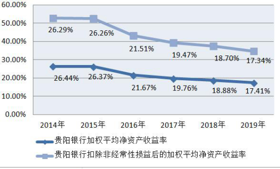 中国经济网记者发现,贵阳银行的ROE已连续5年下滑。2014年至2019年,贵阳银行的加权平均净资产收益率分别为26.44%、26.37%、21.67%、19.76%、18.88%、17.41%;扣除非经常性损益后的加权平均净资产收益率分别为26.29%、26.26%、21.51%、19.47%、18.70%、17.34%。