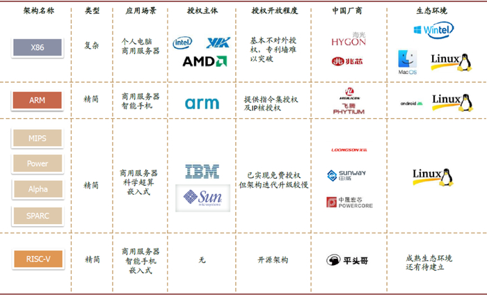 架构是CPU设计最底层的核心技术。目前存在:1)以Intel/AMD产品为代表的X86架构,拥有较为完善的生态,可以无缝运行Windows、Linux等主流操作系统。国内,搭载海光(AMD与曙光的合资公司)芯片的服务器已经规模性进入运营商集采。上海兆芯的PC处理器也得到商用。2)ARM架构芯片成熟,但软件生态有待培育。华为海思和天津飞腾(中国长城控股32%)是目前主要供应商。3)RISC-V是较新的精简指令集,适用于物联网等分散化应用,阿里平头哥基于该架构推出了面向AIoT应用的玄铁IP。