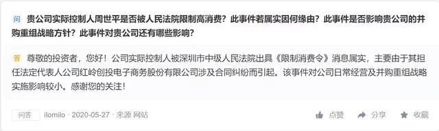 深南股份于5月27日下午在互动平台回复称,公司实际控制人周世平被深圳市中级人民法院出具《限制消费令》消息属实,主要由于其担任法定代表人公司红岭创投电子商务股份有限公司涉及合同纠纷而引起。该事件对公司日常经营及并购重组战略实施影响较小。