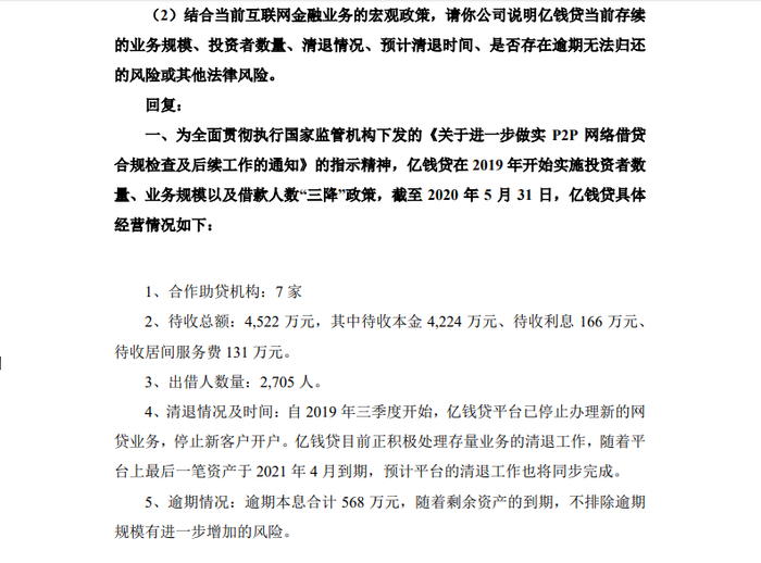 数据显示,截至2020年5月31日,亿钱贷待收总额4522万元,出借人数量2705人,逾期本息合计568万元。“随着剩余资产的到期,不排除逾期规模有进一步增加的风险。”深南股份在回复深交所年报问询函时指出。