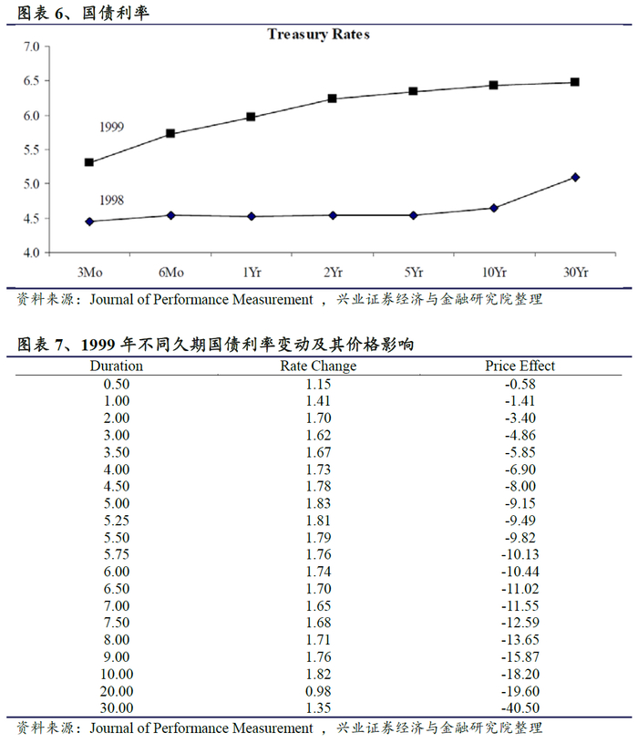 国债效应是指由于国债利率变动导致的成分债券价格变动,反映了投资对于利率变动的敏感性。图表6展示了1999年国债利率的变化趋势,具体数据见图表7。国债效应需要使用与投资组合久期相同的国债在计算期内的利率变动。例如ABS的久期为3,ABS的国债效应就需要使用久期为3的国债利率变动。MBS的久期为2,其国债效应就需要使用久期为2的国债利率变动。