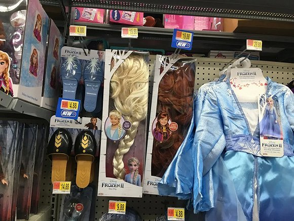 Jakks的Cos服饰大部分成套上市,但是不会成套售卖,以最受欢迎的《冰雪奇缘2》公主服为例,Elsa和Anna的两套公主服,假发、衣服、靴子,都是分开售卖的,而且还会区分成人款和儿童款。这种销售方式能够显而易见地增加销量和利润,消费者也能自由选择。