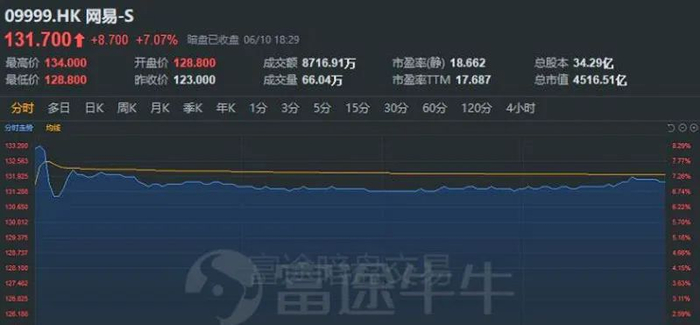 6月11日正式在港股挂牌交易的网易,在6月10日盘后开启暗盘交易。富途证券提供的暗盘交易情况来看,网易暗盘开盘报128.8港元,收报131.7港元,成交额逾8700万港元。收盘价相对于123港元的发行价涨幅达到7.07%。次日,网易开盘报价133港元,与富途证券的暗盘收盘价相差1.3港元。