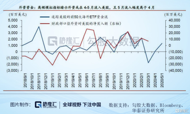 那么4月-5月份呢,根据华泰证券整理的数据,追踪美股的前50海外大海外ETF资金流4月与5月均是净流入,并且5月净流入环比增加。这表明大概率海外投资者是在持续买入美股,是这波美股上涨的主力军之一,至于到底是哪国土豪疯狂杀入,可能还要等美联储和美国财政部更详细的数据。