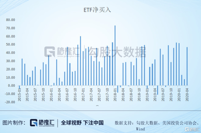 从下图可以看出,今年2月、3月疫情正发酵时,ETF依然是净流入,但规模要小,到4月,ETF的投资热情被点燃了,可见,被动基金对美股的热情持续不减。