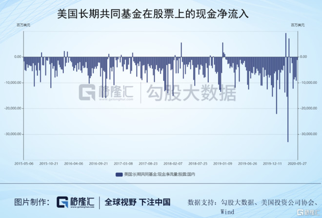 那美国国内的机构呢?我们看下美国的共同基金,也就是国内俗称的公募,很明显,美国公募们要怂得多,资金在持续流出。不过,在这波疫情前,美国公募在股东上就是净卖出了,也很难说他们现在卖出是因为疫情而仓皇出逃。从下图也可以看出,疫情爆发后,除了3月25日那周,它们基本上是按部就班地流出,并没有出现加速流出。