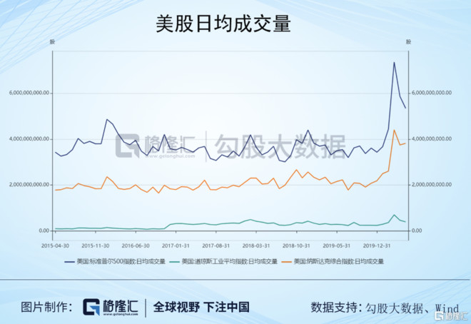 从交易量看,疫情发酵后,美股的日均成交量明显放大,无论是标普500,还是道指,还是纳斯达克,表明大量的资金在抄底。