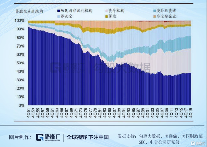 在去散户化的过程中,资管机构和海外投资者的比例不断扩大,1951年的时候,两者合计占比5%左右,而到2019年四季度,两者占比合计达49.6%。