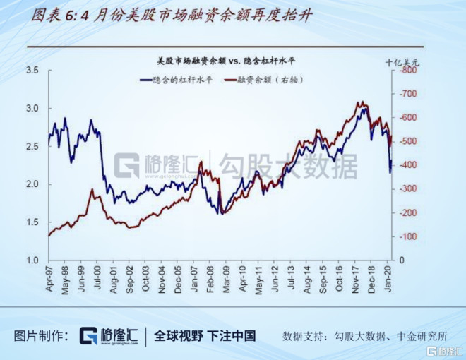 另外,4月份以来美股市场的融资余额再度抬升。