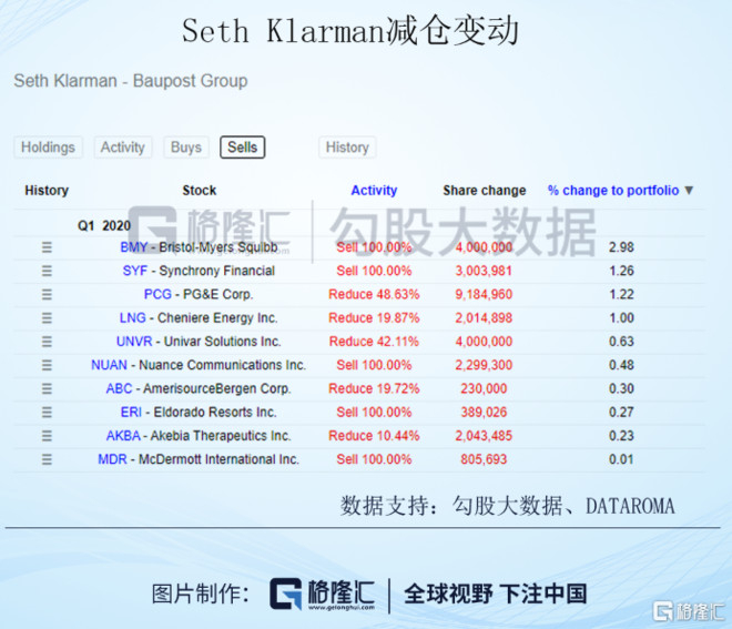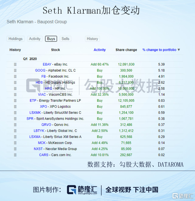 这是Seth Klarman的,操作就跟上面那位完全相反。他买入对组合的仓位影响是22.85%,表明在暴跌中他加了许多仓,而且主要加的就是科技股,谷歌和FB买了许多,卖出对组合的影响8.38%。4月、5月他怎么操作的,目前无法知晓,我倾向于认为他继续加仓了科技股。