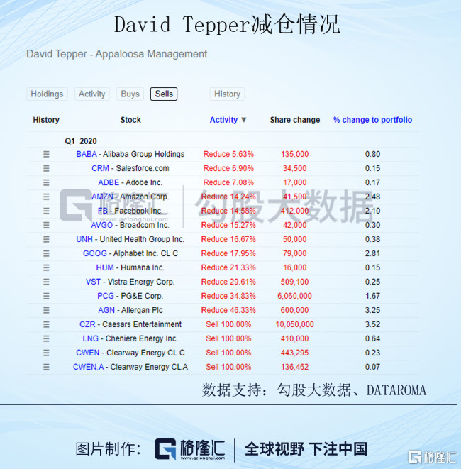 这是DAVID TEPPER的,从一季度看,有买入有卖出,买入对仓位影响16.57%,卖出对仓位影响18.97%,整体还是卖出,而且减了不少科技股,像亚马逊、谷歌和FB,回头看亏大了。不知道4月、5月有没有更改操作,要看二季度的13F文件了。