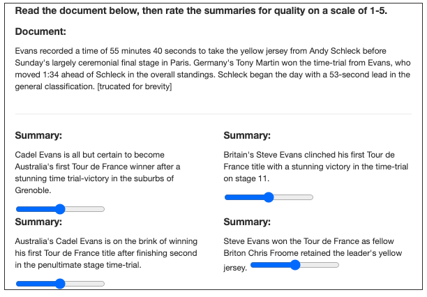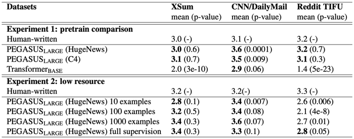 谷歌将模型生成的摘要和人类提取的摘要放在一起,给用户进行评估。在3个不同数据集上进行的实验表明,打分的人有时会更喜欢机器生成的摘要。