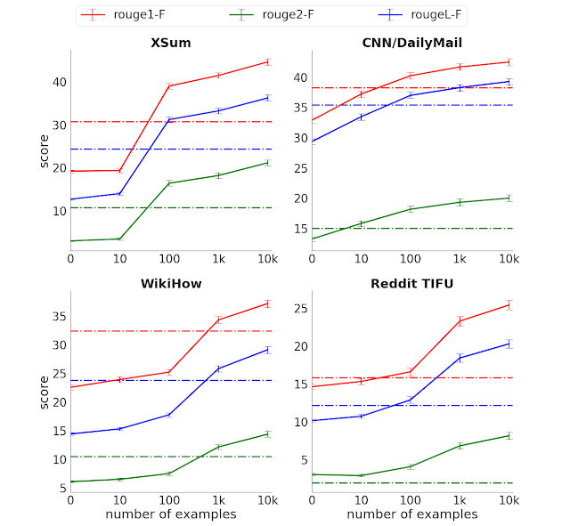 下图展示了在四个选定的摘要数据集中,ROUGE得分与监督样本数量的关系。虚线表示具有全监督但没有预训练的Transformer编码器-解码器的性能。