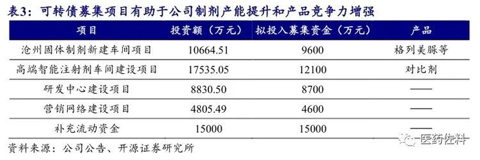 2020年4月公司发布公告,拟公开发行可转债,募集资金不超过5亿元,用于沧州固体制剂新建车间项目等5个项目。项目完成后公司对比剂和降糖药制剂产能将进一步提升;营销网络建设网点布局也将从北向南延伸,以北京为中心,向东北、中部区域发散,有利于增强公司营销管理能力,保持产品市场竞争力。