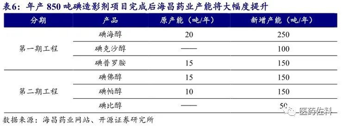 目前海昌药业仅有一条生产线,碘海醇的订单量已经饱和。年产 850 吨碘造影剂项目正在建设之中,项目建成后其产能将大幅提升,品种也将由以碘海醇为主扩大到多种碘对比剂,一期工程有望于2020年下半年投产。我们认为公司通过控股海昌药业进一步提升了对上游原料药的把控能力,完善了自身原料药+制剂产业链一体化布局,盈利能力有望进一步增强。