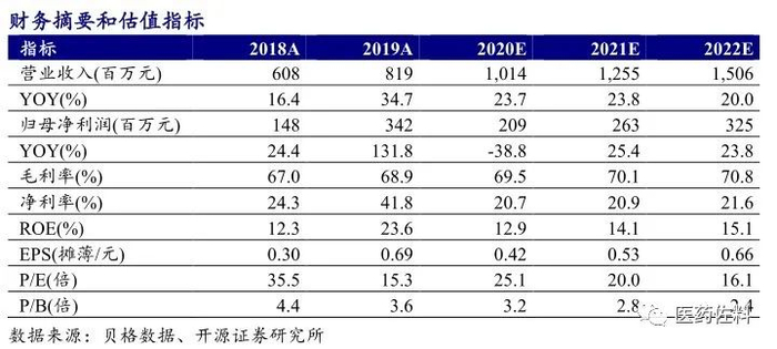 我们预计公司2020年/2021年/2022年分别实现营业收入10.14亿元/12.55亿元/15.06 亿元,同比增长 23.7%/23.8%/20.0%,实现归母净利润 2.09亿元/2.63亿元/3.25 亿元,同比增长-38.8%/25.4%/23.8%,EPS 分别为 0.42元/0.53元/0.66 元,当前股价对应 PE 分别为25.1/20.0/16.1。2020年公司归母净利润下降主要是由于2019年公司将世和基因股权从长期股权投资转入以公允价值计量且其变动计入当期损益的金融资产,确认投资收益1.75亿元,而2020年无此项收益。对比剂行业竞争格局良好,潜在市场空间大,公司作为国内对比剂行业龙头企业之一,未来有望继续稳健增长,并通过控股海昌药业,完成原料药+制剂产业链一体化布局。