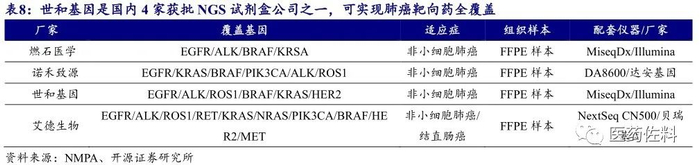 世和基因成立于2008年,致力于临床肿瘤精准分子检测、液体活检及临床转化研究。2013年创新推出大Panel实体瘤NGS基因检测。2018年9月自主研发的NGS测序试剂盒“EGFR/ALK/ROS1/BRAF/KRAS/HER2 基因突变检测试剂盒(可逆末端终止测序法) ”通过创新医疗器械特别审批程序获批上市,成为国内4家获批NGS测序试剂盒的公司之一。该试剂盒共检测14个基因,其中6基因(EGFR、ALK、ROS1、BRAF、KRAS、HER2)获批用于检测非小细胞肺癌,实现肺癌靶向用药基因全覆盖,同时还可以检测RET、MET、PIK3CA、NF1、PTEN、NRAS、AKT1、MEK1等下游信号通路的重要节点基因。