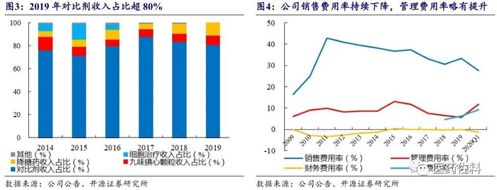 对比剂是公司支柱性产品,2019年收入占比达80%以上,近年来由于其他低基数品种九味镇心颗粒、降糖药等增速较快,对比剂收入占比有所下降。费用方面,随着公司收入体量的增长,规模效应逐步体现,销售费用率呈现下降态势;2019年起公司实施股权激励,2020年1季度由于确认股权激励费用,管理费用率有所提升。
