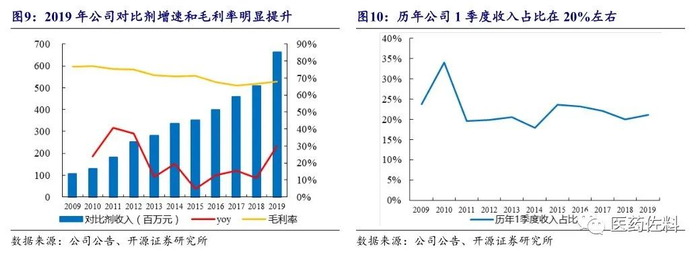 2019年公司对比剂业务实现营业收入6.63亿元,同比增长30.07%,增速达到了近年来最好水平,主要受益于碘克沙醇和碘帕醇快速放量以及碘海醇和钆喷酸葡胺稳健增长。毛利率自2018年起逐步提升,主要是由于:1)高毛利品种碘帕醇和碘克沙醇增速更快,收入占比提升;2)公司取得原料药厂商海昌药业后股权后议价能力提升。目前公司已经成为海昌药业控股股东,议价能力进一步增强,预计未来毛利率仍然提升空间。2020年1季度公司对比剂收入下滑主要是由于疫情的影响,对比剂主要用于心脑血管造影、CT增强扫描等,需求相对刚性,相应的医疗需求仍然存在,随着医院诊疗秩序逐步恢复正常,我们认为公司对比剂收入环比和同比增速均将逐季度出现改善。公司历年1季度收入占比仅在20%左右,我们认为1季度业绩下滑对全年业绩影响有限。长期来看由于对比剂行业竞争格局良好,市场潜力仍然较大,我们仍然看好公司对比剂业务长期发展。