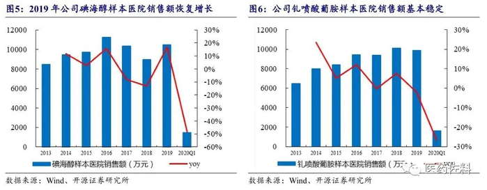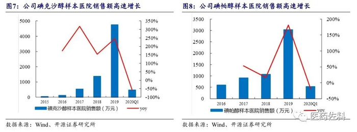 公司的碘克沙醇近年来保持高速增长,主要是由于2015年新一轮药品招标开始后中标省份数量迅速增加,2019年公司碘克沙醇样本医院销售额为4750万元,同比增长246.46%,实际销售额在1亿元左右。2020年1季度受疫情影响,该品种样本医院销售额为479万元,同比下滑57.95%。