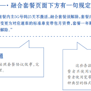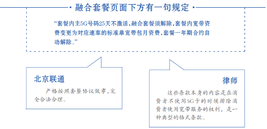 在北京联通网上营业厅,北京商报记者找到了张先生所办理的融合套餐,该融合套餐页面下方有这样一句规定:“套餐内主5G号码25天不激活,融合套餐须解除,套餐内宽带资费变更为对应速率的标准单宽带包月资费,套餐一年期合约自动解除。”