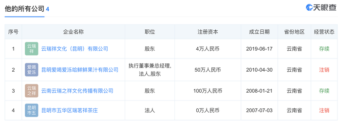 李芮均在国内担任股东的公司除云瑞之祥和昆明爱喝爱泺哈鲜鲜果汁有限公司外,还有一家为云瑞祥文化(昆明)有限公司(2019年,注册资本4万人民币,存续)。