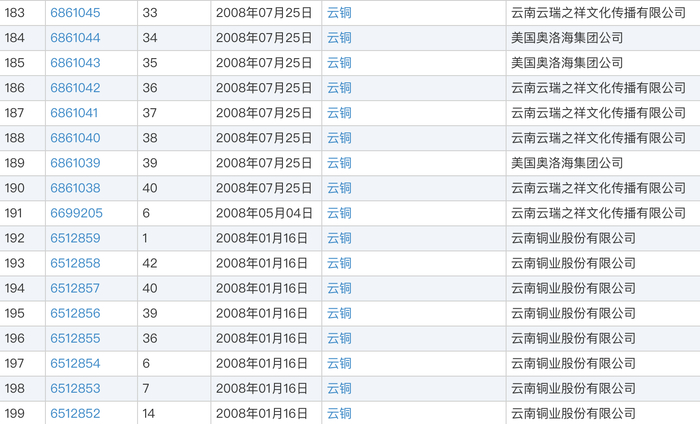而查阅“云铜”商标可发现,2019年2月,大量“云铜”商标被云瑞之祥同时转移至这桩天价商标案的另一主角美国奥洛海集团公司(下称“美国奥洛海”)。这也就意味着,这批天价商标实际上颇有故事。
