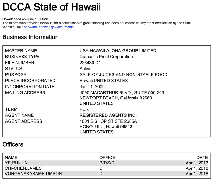 奥洛海英文名称为“USA HAWAII ALOHA GROUP LIMITED”,这家位于加利福尼亚州的公司注册于2009年6月,经营“果汁和副食品销售”,主要成员为云瑞之祥最大股东叶芮均(YE,RUIJUN)、2010年加入中国云铜董事名单的 VONGANAKASAME UMPON,以及CHI-CHEN,JAMES。