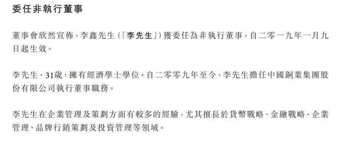 公告对李鑫的介绍为:31岁,拥有经济学士学位,自2009年至今,担任中国铜业集团股份有限公司执行董事职务。在企业管理及策划方面有较多的经验,尤其擅长于货币战略、金融战略、企业管理、品牌行销策划及投资管理等领域。