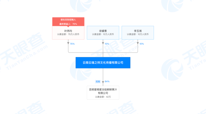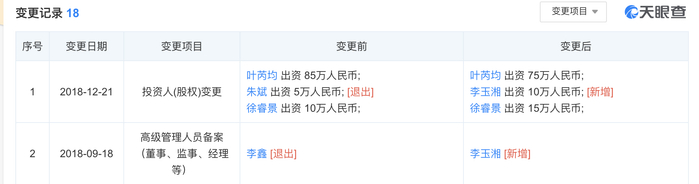 目前,该公司股东为叶芮均、徐睿景和李玉湘,分别占股75%、15%、10%,法定代表人为徐睿景。在天眼查显示的变更记录中,还有一条显示,2018年9月,高级管理人员李鑫(1987年生)退出。