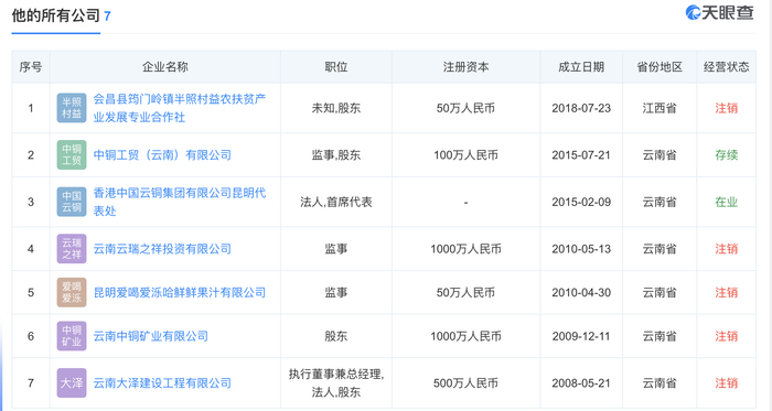 另外,在中国云铜官网中曾经被称为“中国铜业董事长、总裁、云铜集团董事长”的许金亮名下也有北京国标博业咨询中心(集体所有制,注册资本3万人民币,已吊销)、云南莫顿格兰环保工程有限公司(2009年,注册资本500万人民币,已注销)。