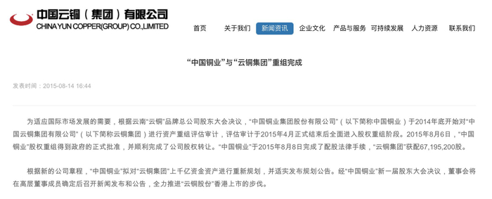 实际上,早在2015年8月,中国云铜即在官网宣称,其与另一家在香港注册的“中字头”民企中国铜业集团股份有限公司(CHINA COPPER GROUP HOLDING CO., LIMITED,)重组完成,“将全力推进‘云铜股份’香港上市的步伐”。