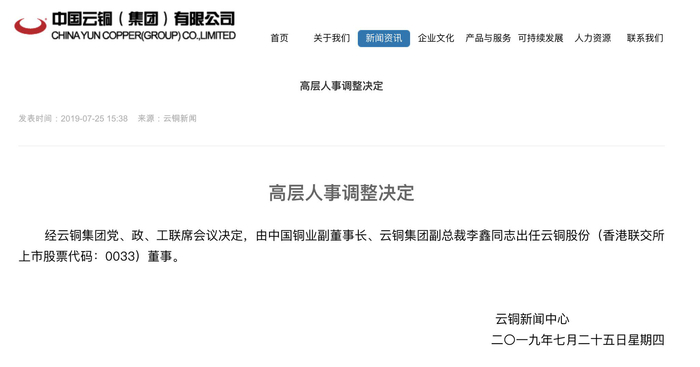 与此印证的是,2019年7月25日,中国云铜官网发布“高层人士调整决定”,称“经云铜集团党、政、工联席会议决定,由中国铜业副董事长、云铜集团副总裁李鑫同志出任云铜股份(香港联交所上市股票代码:0033)董事”。而早在2019年1月9日,云铜股份(彼时称“亚投金融集团”)已公告宣布,委任李鑫为公司非执行董事。