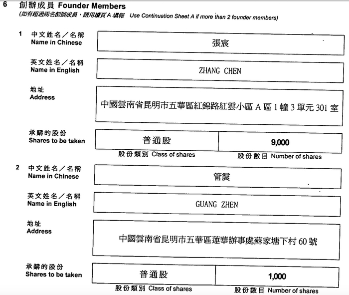 一名为1969年生人张宸,另一名为1970年生人管震,两人住址均显示为昆明市五华区。公司注册股本为普通股10000股,张宸承购9000股,管震承购1000股。