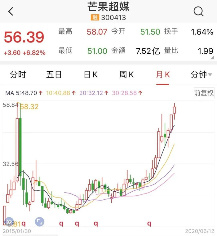 与此同时,制作方芒果TV在两天内已由iOS免费榜第93名冲到了第4名。资本当然也迅速捕捉到了这一热点,尽管开播时已是周五中午,芒果TV运营商“芒果超媒”股价仍应声大涨,截至收盘涨幅达6.82%,公司总市值破千亿元。
