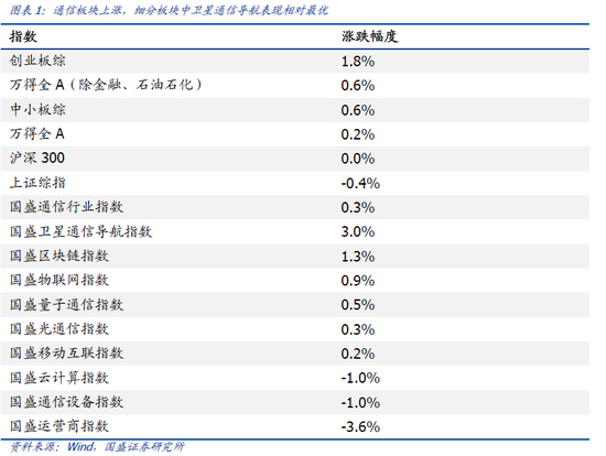 从细分行业指数看,卫星通信导航、区块链、物联网、量子通信、光通信分别上涨3.0%、1.3%、0.9%、0.5%、0.3%,表现优于通信行业平均水平。移动互联上涨0.2%,云计算、通信设备、运营商分别下跌1.0%、1.0%、3.6%,表现劣于通信行业平均水平。