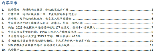 本周重点推荐:(1)光通信:新易盛300502、华西股份000936、天孚通信300394、中际旭创300308、剑桥科技603083、中天科技600522。(2)5G基建:中兴通讯000063、沪电股份002463。(3)数据中心:沙钢股份002075、光环新网300383、数据港603881、奥飞数据300738、英维克002837。持续推荐:深信服、能科股份、星网锐捷、沪电、紫光股份等。