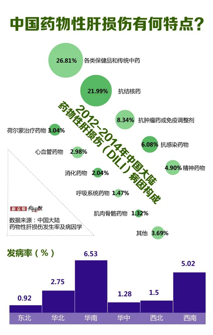 这一期间,中国大陆引起肝损伤的最主要药物中,各类保健品和传统中药占到26.81%,其次是抗结核药、抗肿瘤药或免疫调整剂等,其他国家则大多以抗生素引发的肝损伤为主。多项研究也印证了这一结果。