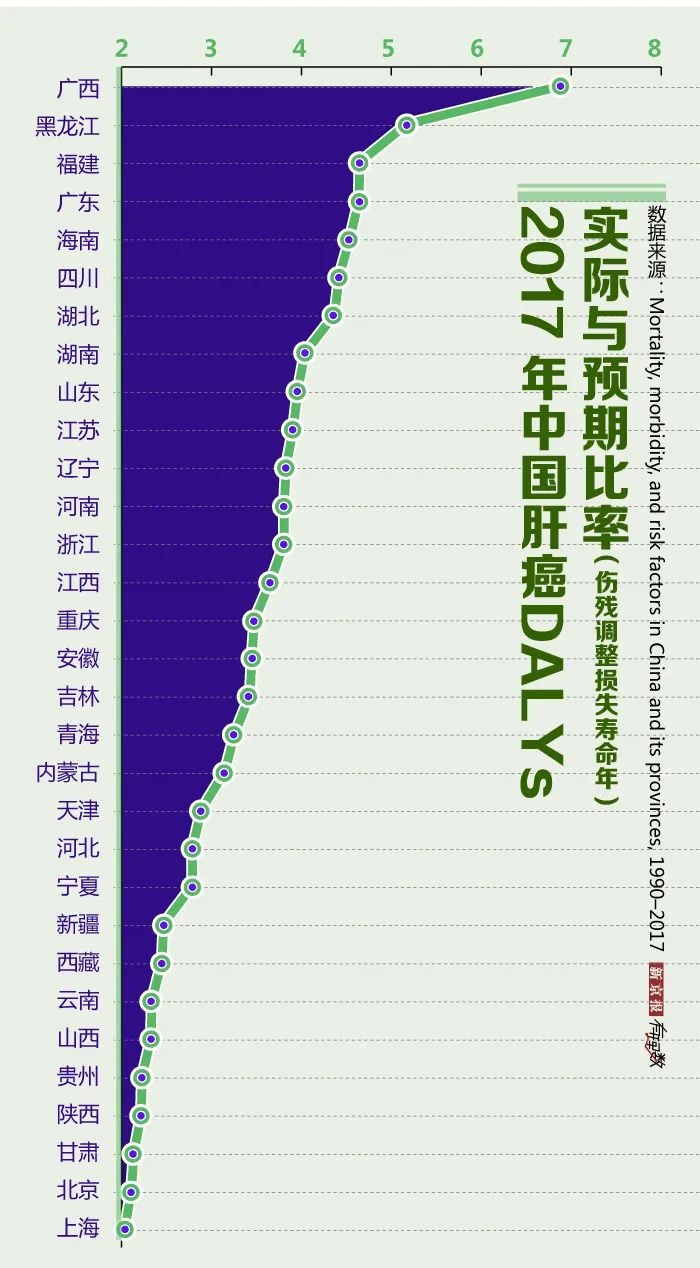2017年,所有省份肝癌的伤残调整生命年(DALYs)2均是预期值的2-6倍,所有排名前20的三级病因中,只有肝癌被普遍“低估”了。