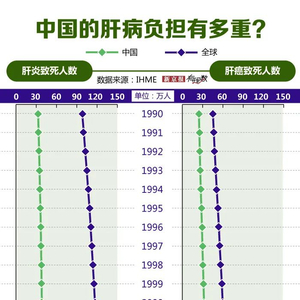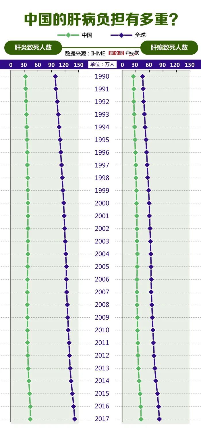 1990年以来,中国死于肝炎相关疾病的人数在不断升高。2017年,中国有超过43万人死于肝炎相关疾病,占全球的三成以上;2017年,中国有超过41万人死于肝癌,占到全球的一半以上。