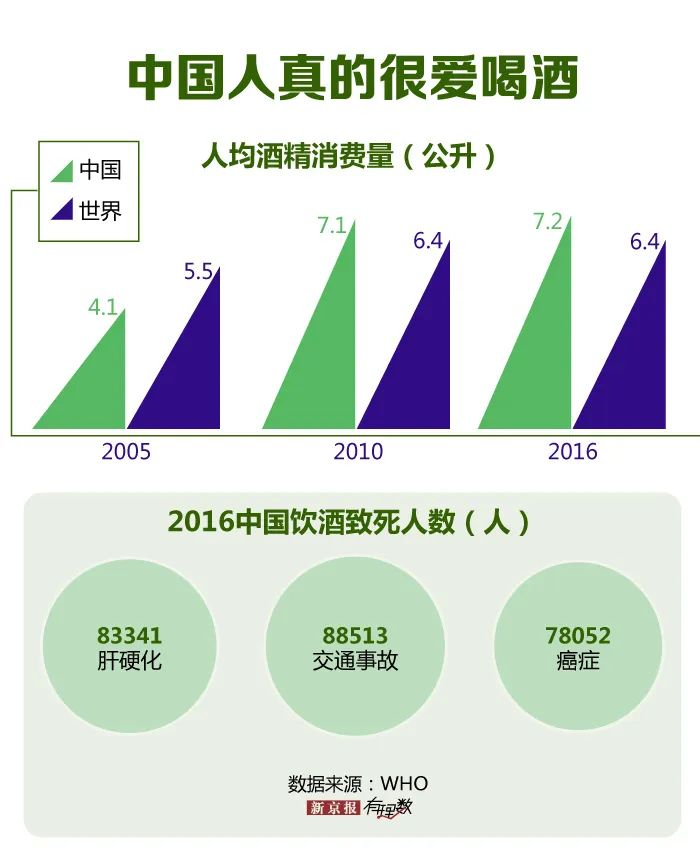 据世界卫生组织《2018全球酒精与健康报告》,2016年,中国15岁及以上人群人均年摄入纯酒精7.2升,2005年到2016年酒精摄入量的增幅高达76%。