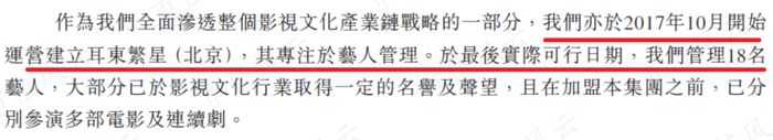 接下来是艺人经纪。2017年10月,耳东影业设立子公司耳东繁星,开始专注于艺人管理业务。