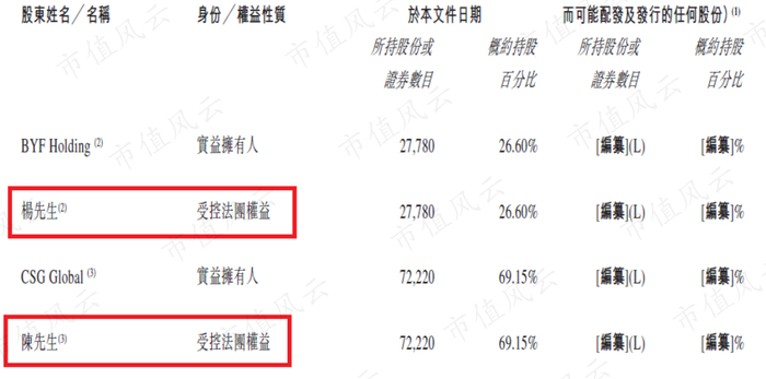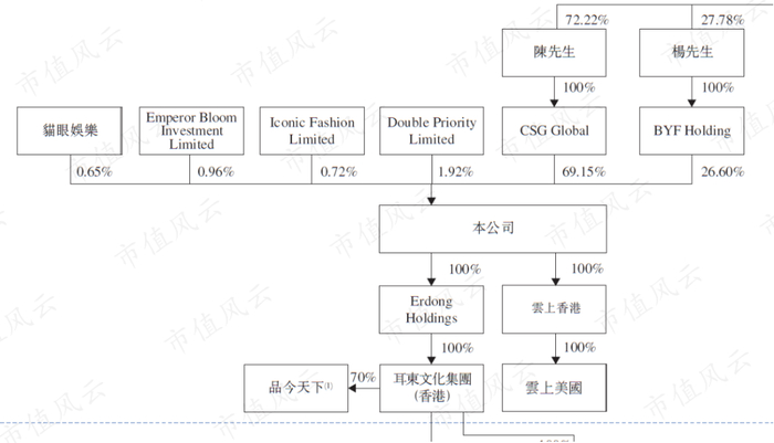 首先是创始人背景,根据招股说明书里的资料,耳东影业的创始人有两位:陈硕罡和杨凡。陈硕罡持有耳东影业69.15%的股份,是耳东影业的主席兼执行董事;杨凡持股比例为26.6%,是耳东影业的执行董事兼CEO。