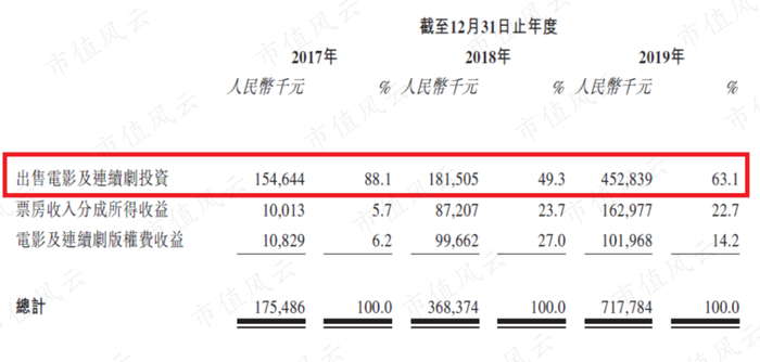 影视剧的投资收入占影视剧业务总收入的比例虽然从2017年的88.1%下降至2019年的63.1%,但还是影视剧业务的第一大收入来源。