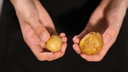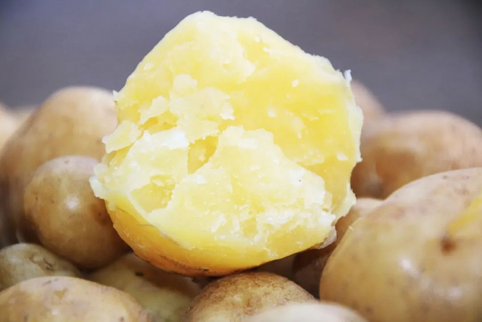 由于皮太薄,出锅的土豆一个个都“龇牙咧嘴”。对半掰开一个,里面的薯肉是淡黄色的,质地像绿豆糕般细嫩,散发着淡淡的香气。