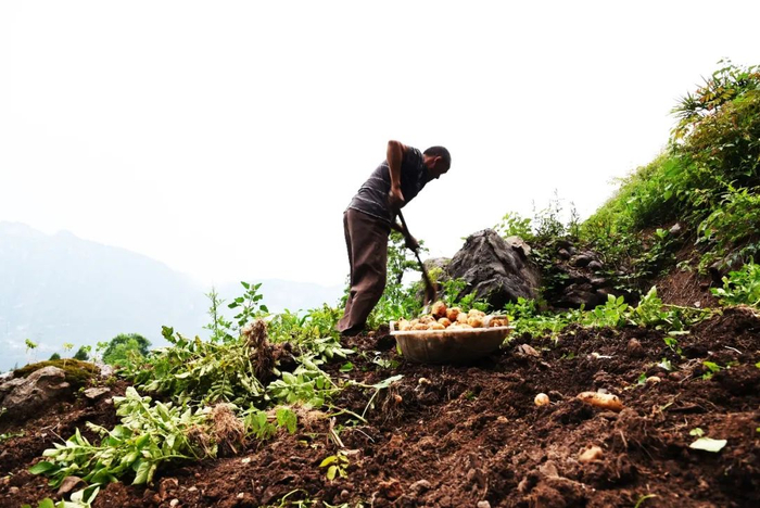 采挖以后,又一担担往家背。这一颗小小的土豆浓缩了果农们的诚意和汗水。