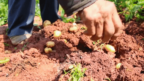 其中一个老爷爷引起了我们的注意,只见他快速翻挖两下,把鸡蛋大小的土豆一个个丢进小框,不到2分钟便提着篮子往家走,步伐略显着急。