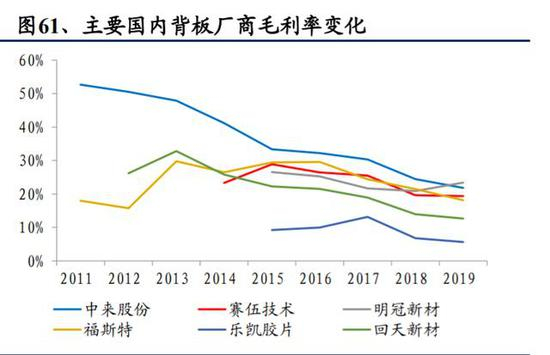 背板价格逐年下滑,厂商毛利率也受到压缩。与辅材其他环节不同,背板的价格呈现逐年下降的趋势,以中来和赛伍为例,2015 年至 2019 年背板的价格分别下滑了 42%和 43%。受此影响,各厂商背板业务毛利率也受到压缩,目前明冠新材、中来股份、赛伍技术和福斯特背板业务毛利率在 20%附近,较 2015-2017 年 25-30%的毛利率有明显的下降。